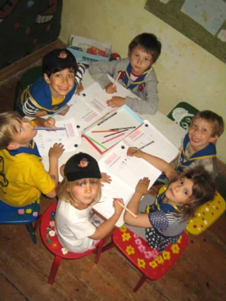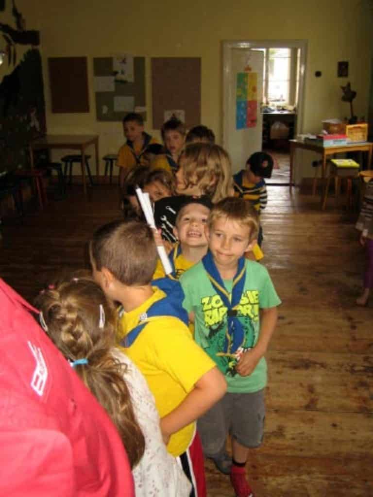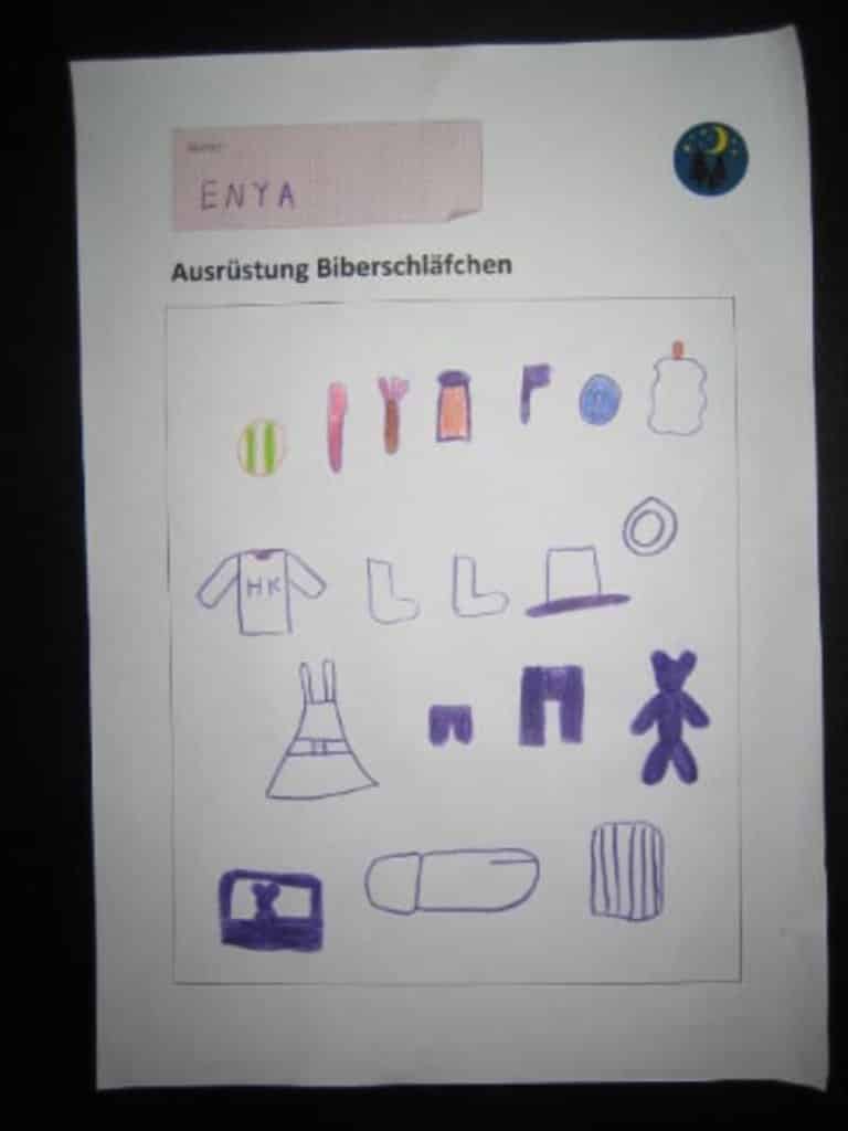 Begrüßungszeremonie, Spiele und dann waren unsere Biber fleißig. Gemeinsam machten wir eine Liste mit unseren „Ausrüstungsgegenständen“ in Biber-Geheimsprache. Jeder Biber weiß jetzt genau, was er für unsere Übernachtung braucht. Als Belohnung gab‘s einen Baumstamm.